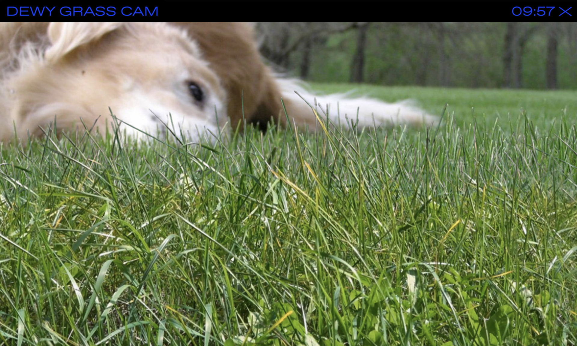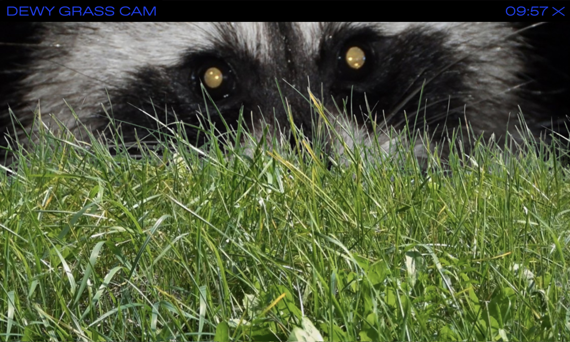 The “Grass Cam” displays a range of scenes (from sports fields, to lawns, to pop culture references) based on the time of day in a user’s location. The site also contains other unique details, such as a vertical text ticker that splits the screen, and simple portfolio pages with interactive images.